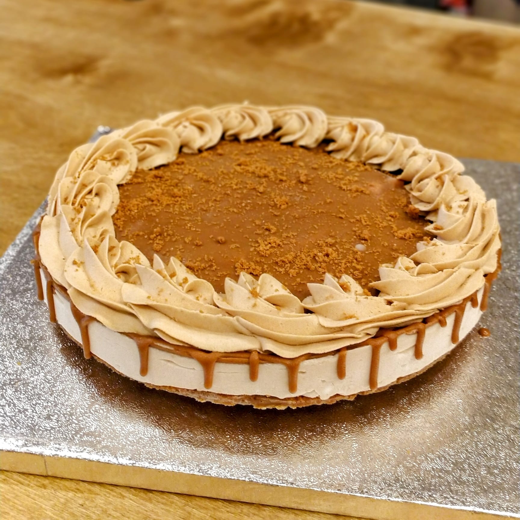 A Biscoff cheesecake with a simple finish and optional text. Other flavours are available.